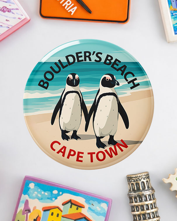Who can resist the charm of Cape Town’s most adorable residents? This delightful fridge magnet features a pair of African penguins waddling side by side along the sandy shores of Boulders Beach in Simon’s Town. The turquoise waves and soft sandy tones create a serene coastal scene that perfectly captures this beloved Cape Town attraction.