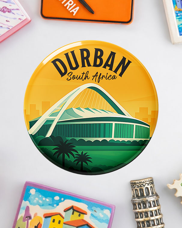 Celebrate one of South Africa’s most spectacular architectural landmarks with this bold fridge magnet. The Moses Mabhida Stadium in Durban, with its sweeping signature white arch against a warm golden sky, became a symbol of national pride during the 2010 FIFA World Cup — and this vibrant green-and-gold illustration captures its dramatic silhouette beautifully, framed by tropical palm trees.