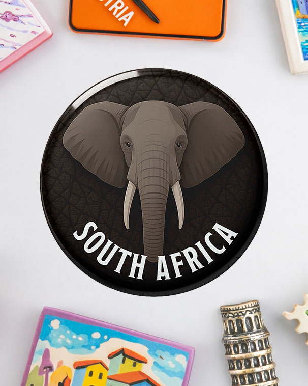 Face to face with Africa’s gentle giant. This dramatic fridge magnet features a stunning frontal portrait of an African elephant — its magnificent tusks, wise eyes, and enormous ears rendered in beautiful detail against a dark, textured background that mimics elephant hide. “SOUTH AFRICA” sits in bold white lettering below.